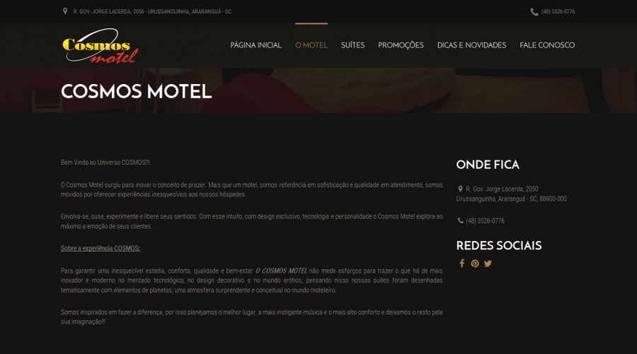 Cosmos Motel inova e fortalece sua marca também na internet. Com foco em proporcionar maior comodidade, a internet atende ao mais crescente canal de atendimento do mundo, e toda empresa atenta ao seu público não poderia ficar fora dessa, nesse intuito criamos um site que seja rápido, prático e interativo especialmente para você.